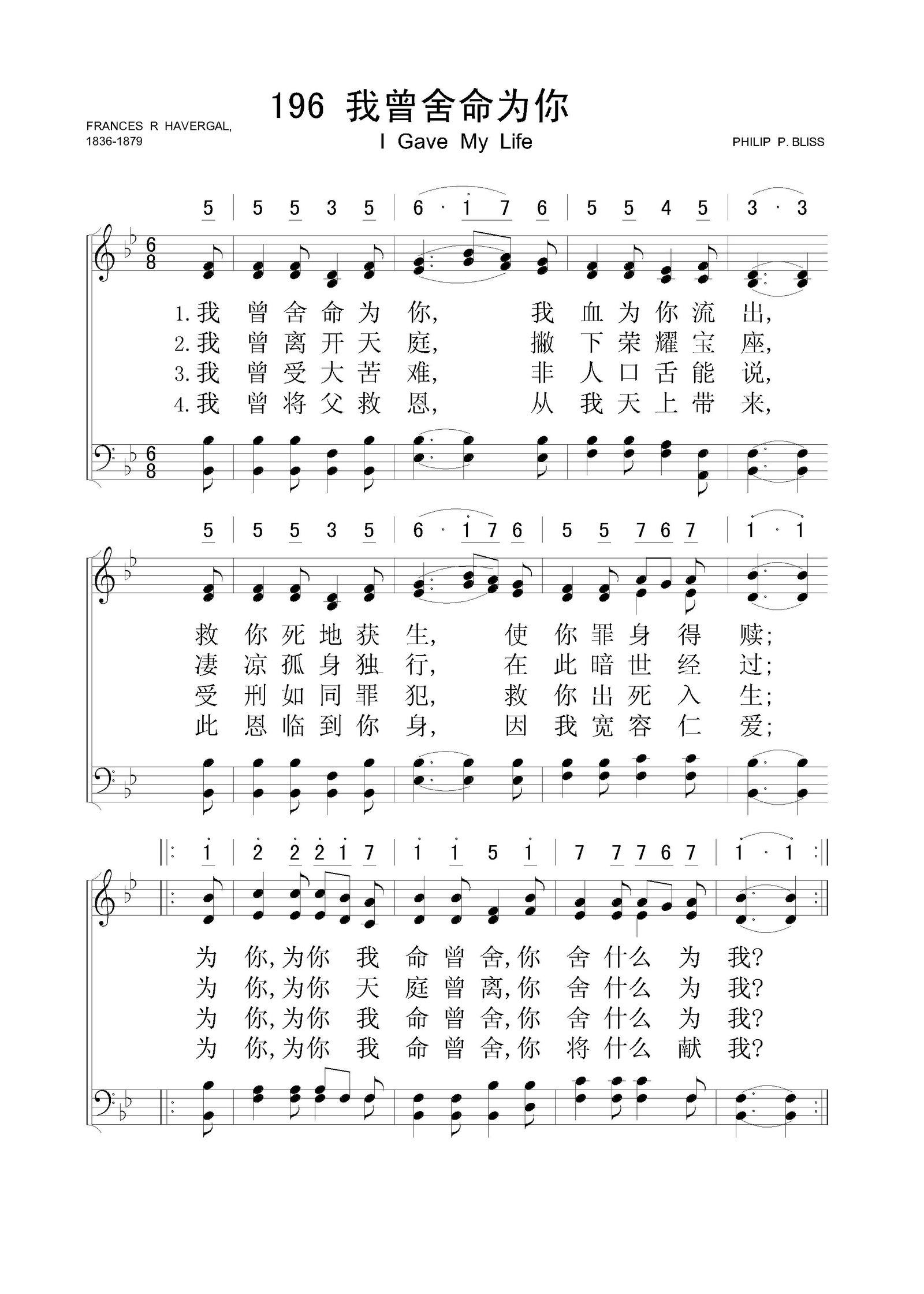 我曾舍命为你 – 四声部五线谱