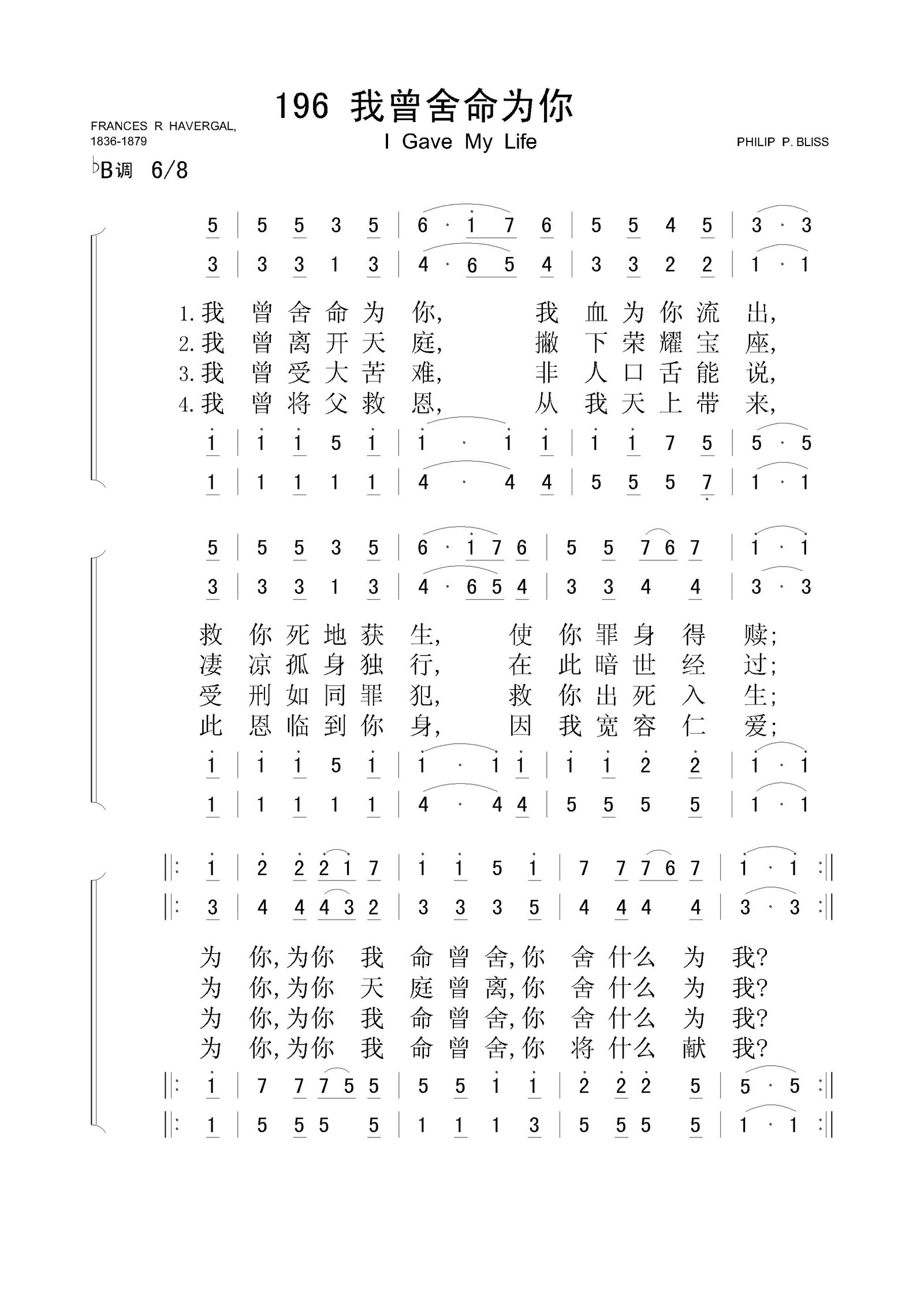 我曾舍命为你 – 四声部简谱