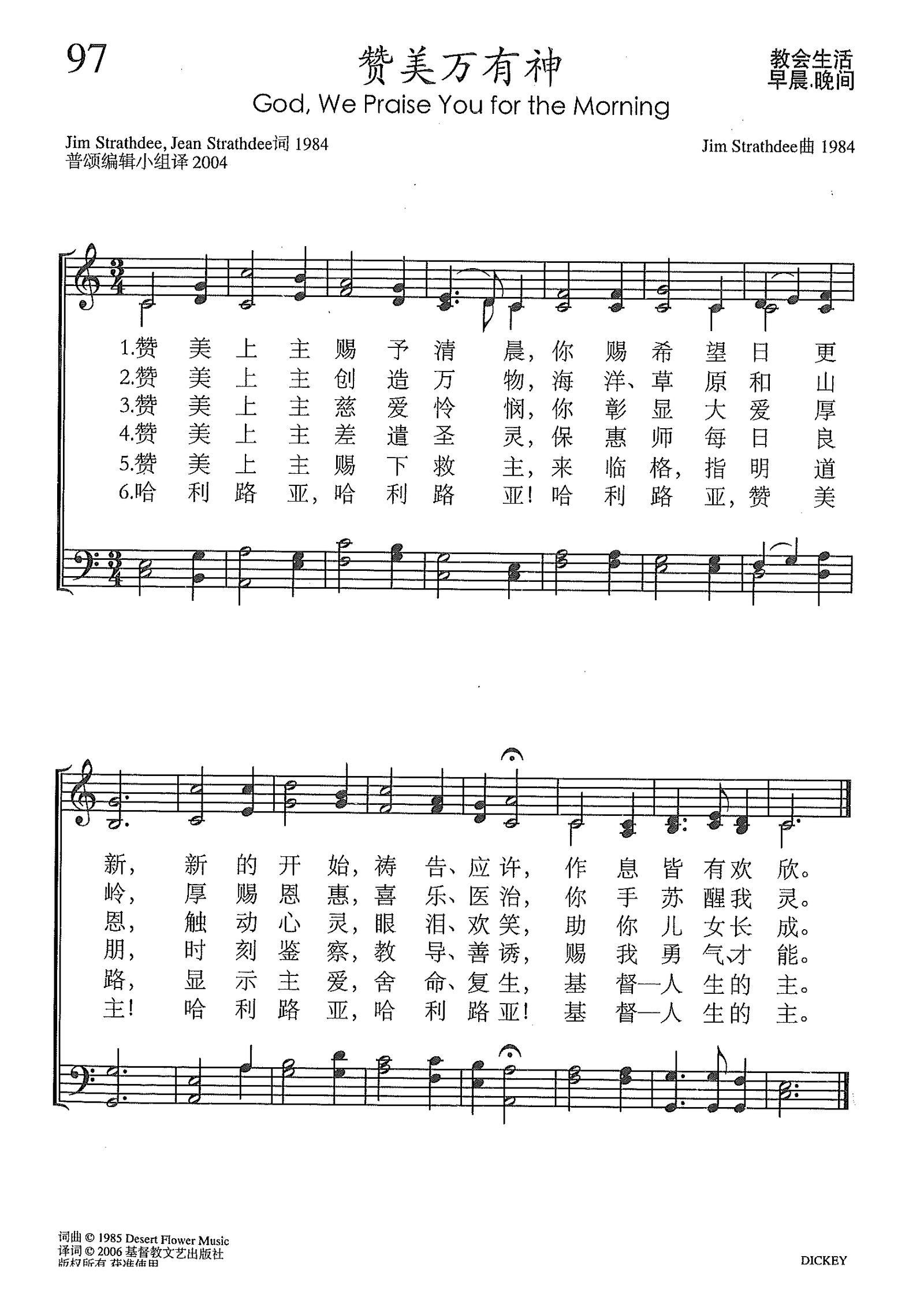 赞美万有神 ( God, We Praise You for the Morning ) 2022年7月14日 作者 Liu, Luke 在线播放和下载: 合唱 四声 https://www.chanshige.online/wp-content/uploads/2022/07/20220714_043146.mp3 下载 女高 https://www.chanshige.online/wp-content/uploads/2022/07/20220714_043129.mp3 下载 女低 https://www.chanshige.online/wp-content/uploads/2022/07/20220714_043025.mp3 下载 男高 https://www.chanshige.online/wp-content/uploads/2022/07/20220714_042909.mp3 下载 男低 https://www.chanshige.online/wp-content/uploads/2022/07/20220714_042735.mp3 下载 伴奏 四声 https://www.chanshige.online/wp-content/uploads/2022/07/20220714_043254.mp3 下载 女高 https://www.chanshige.online/wp-content/uploads/2022/07/20220714_043109.mp3 下载 女低 https://www.chanshige.online/wp-content/uploads/2022/07/20220714_050158.mp3 下载 男高 https://www.chanshige.online/wp-content/uploads/2022/07/20220714_042851.mp3 下载 男低 https://www.chanshige.online/wp-content/uploads/2022/07/20220714_042707.mp3 下载 本首圣诗由网上圣诗班 (石家庄二组)录制 歌谱:1. 四声五线谱 2. 四声部简谱 简介(一) ( 暂缺 ) 赞美万有神 –《赞美诗(新编)补充本》第97首 God, We Praise You for the Morning
