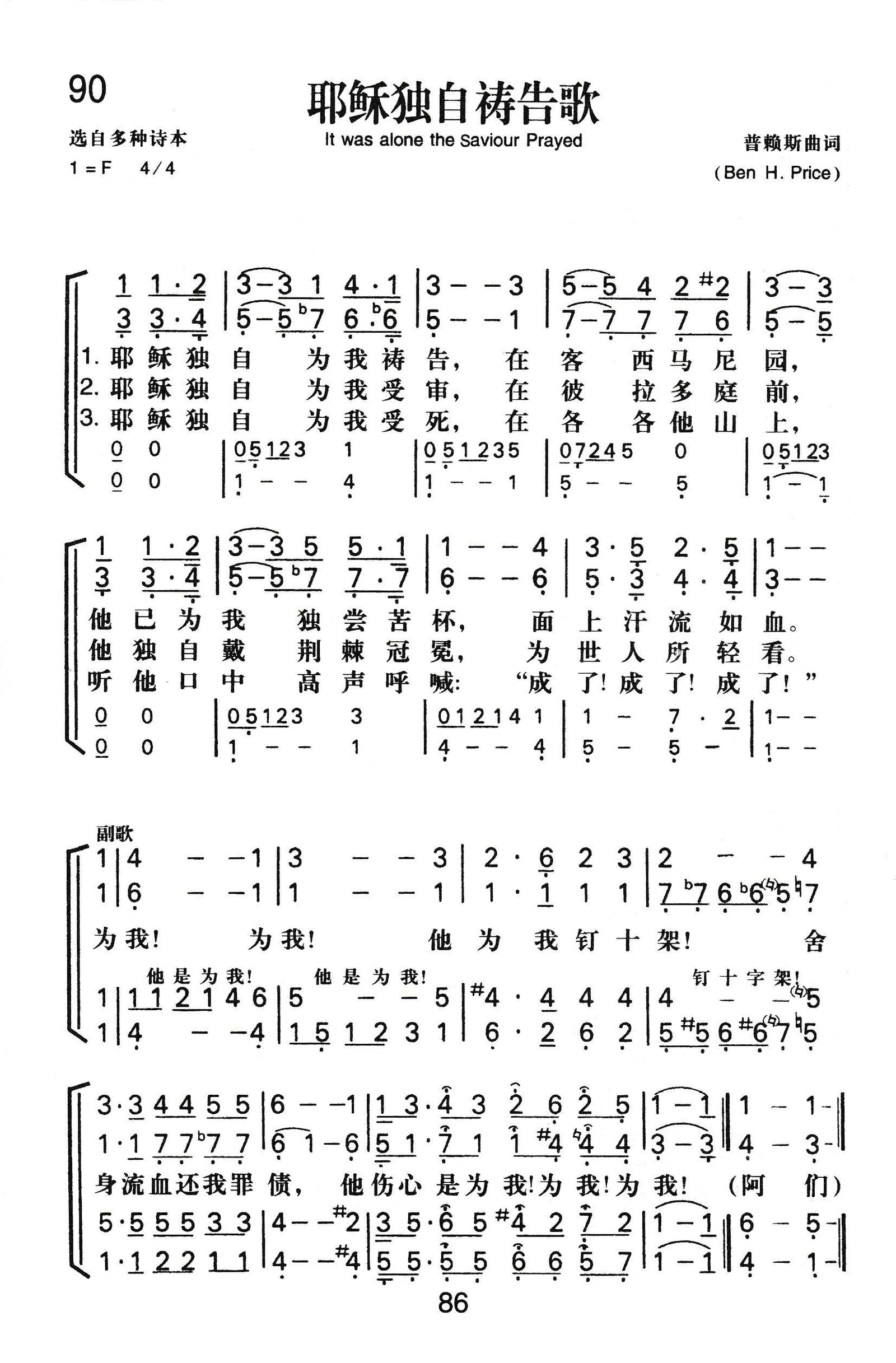 这首《耶稣独自祷告歌》在我国虽有多本圣诗集采用过,但只标明作词与作曲都是普赖斯 (B.H.Price),迄今尚不知道其生卒年代与事迹。