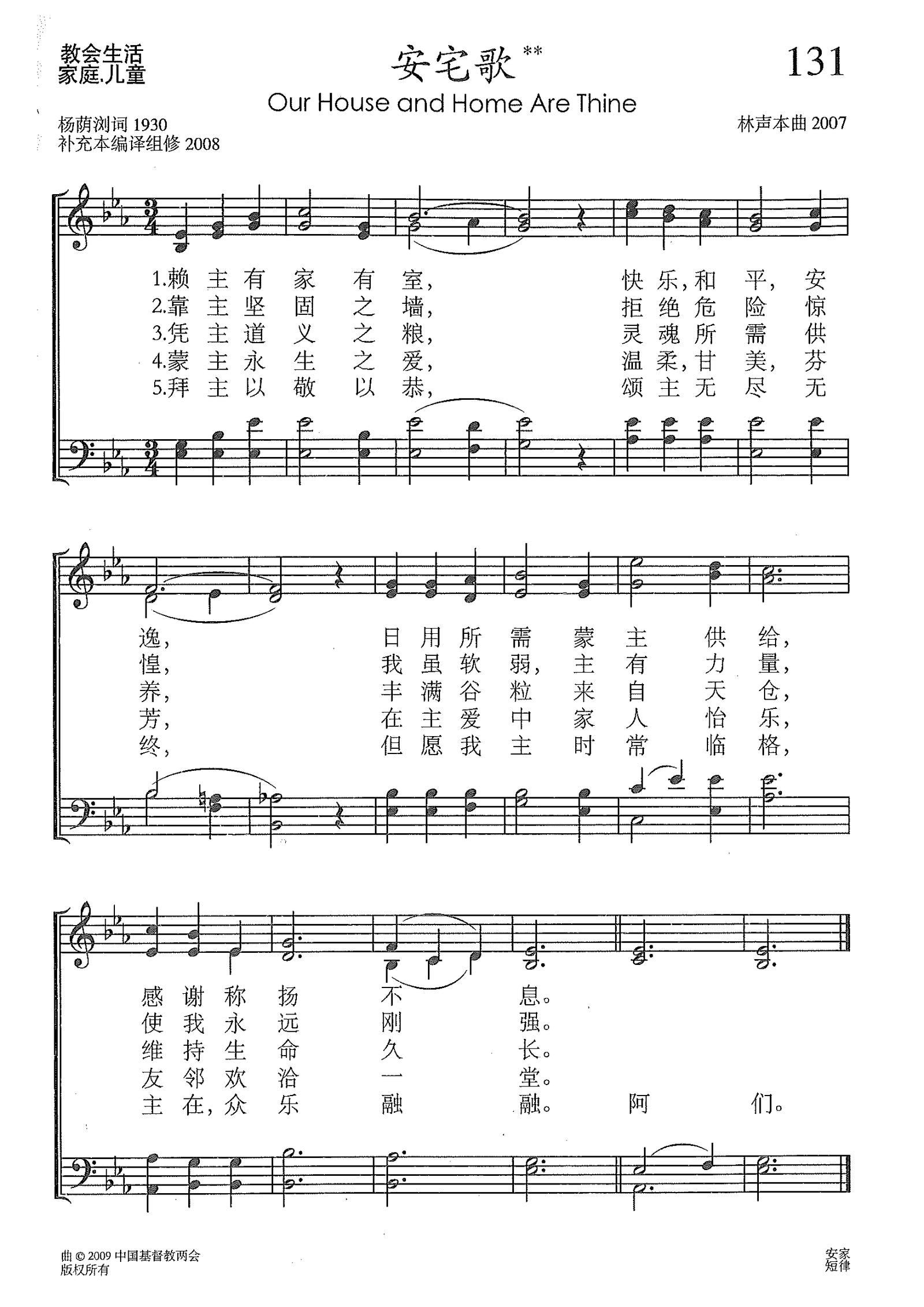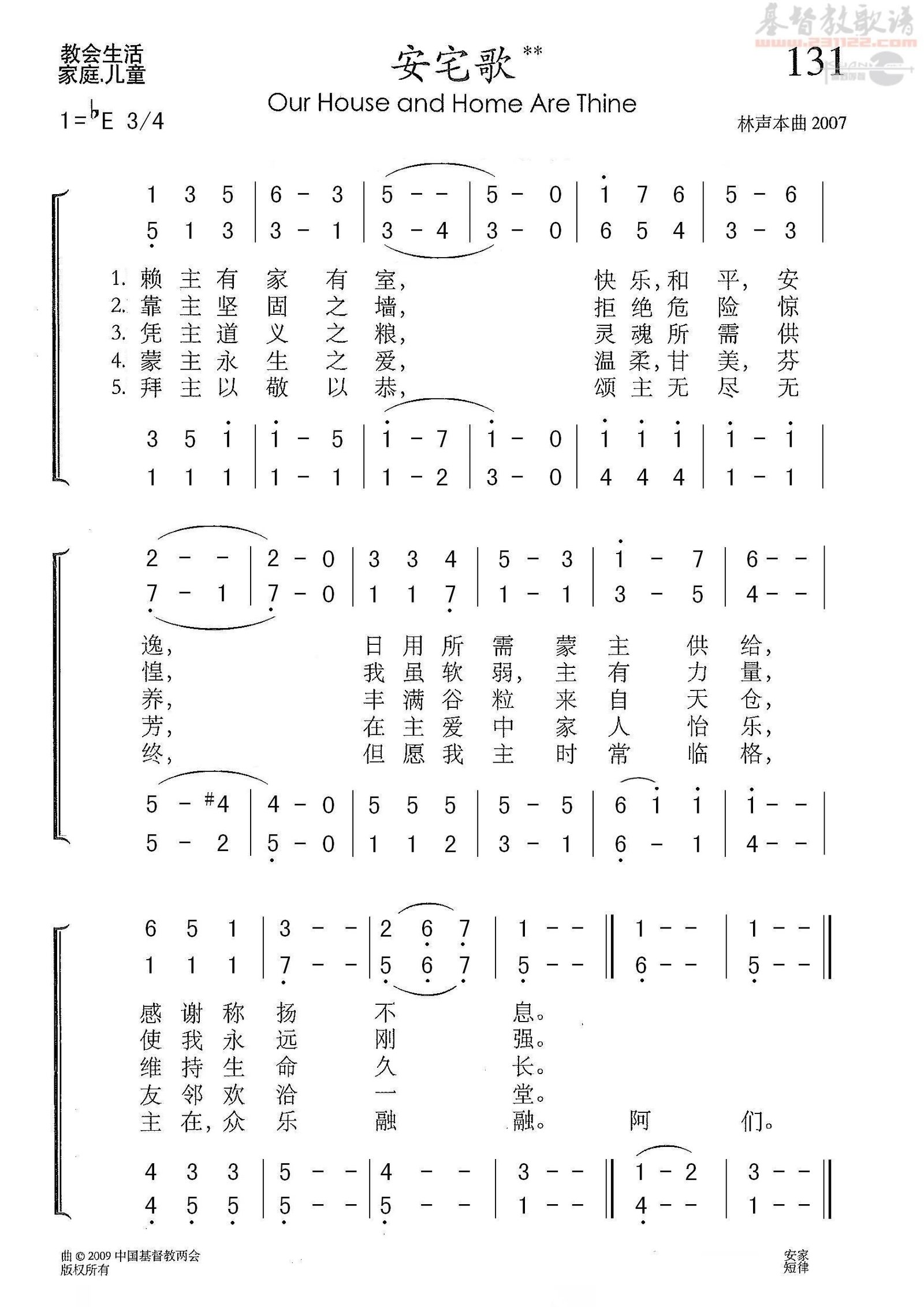 《安宅歌》是杨荫浏(1899-1984)作于1930年。该诗以圣经和基督教教义为依据,共有5节歌词,分别:一、赖主快乐;二、靠主刚强;三、凭主灵粮;四、蒙主厚爱;、五、恭敬拜主为切入口加以展开,把一个基督徒家庭的要求予以具体化,非常生动活泼,易懂易记,确实是一首不可多得的,适合基督教家庭诵唱的圣诗。