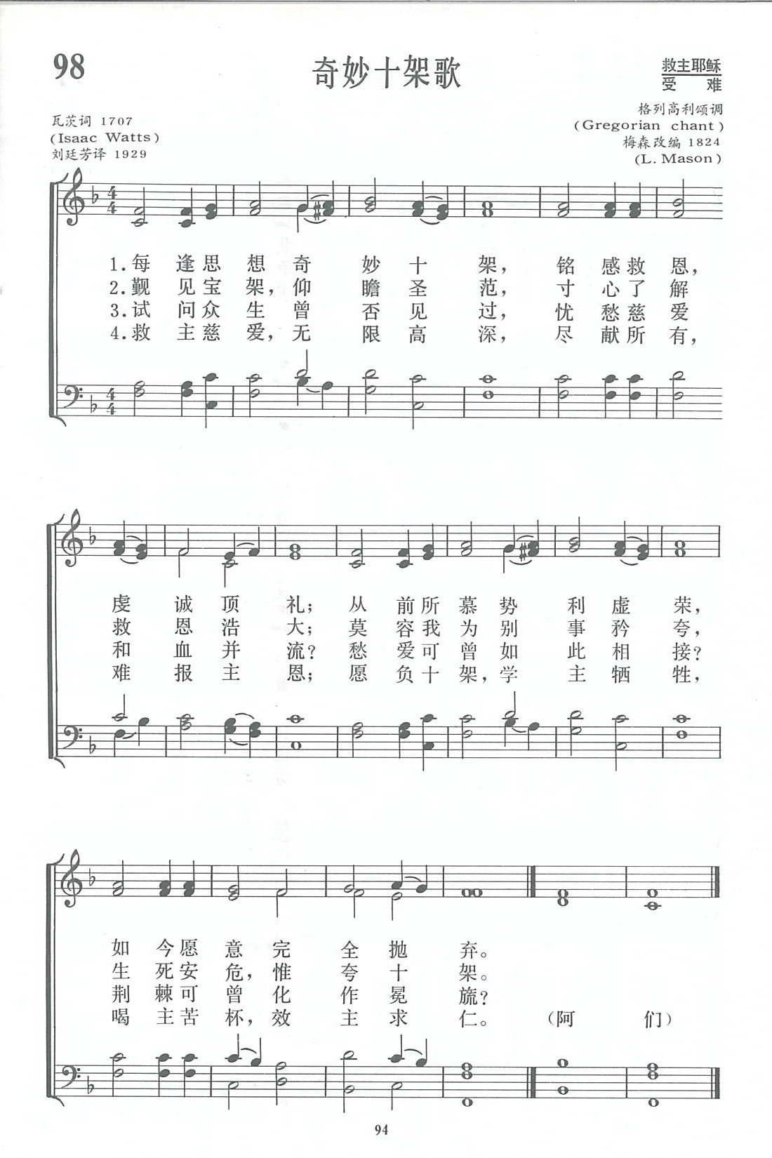 《奇妙十架歌》是英国圣诗之父瓦茨(事略参阅第12首)为圣餐礼拜所作的一首名歌,原载于他1707年所出版的《赞美诗与属灵的歌曲》中,原诗的前面还冠有加拉太书第6章第14节的要旨:藉着基督的十字架钉死了世界。号召信徒效法保罗“断不以别的夸口,只夸我们主耶稣基督的十字架”。