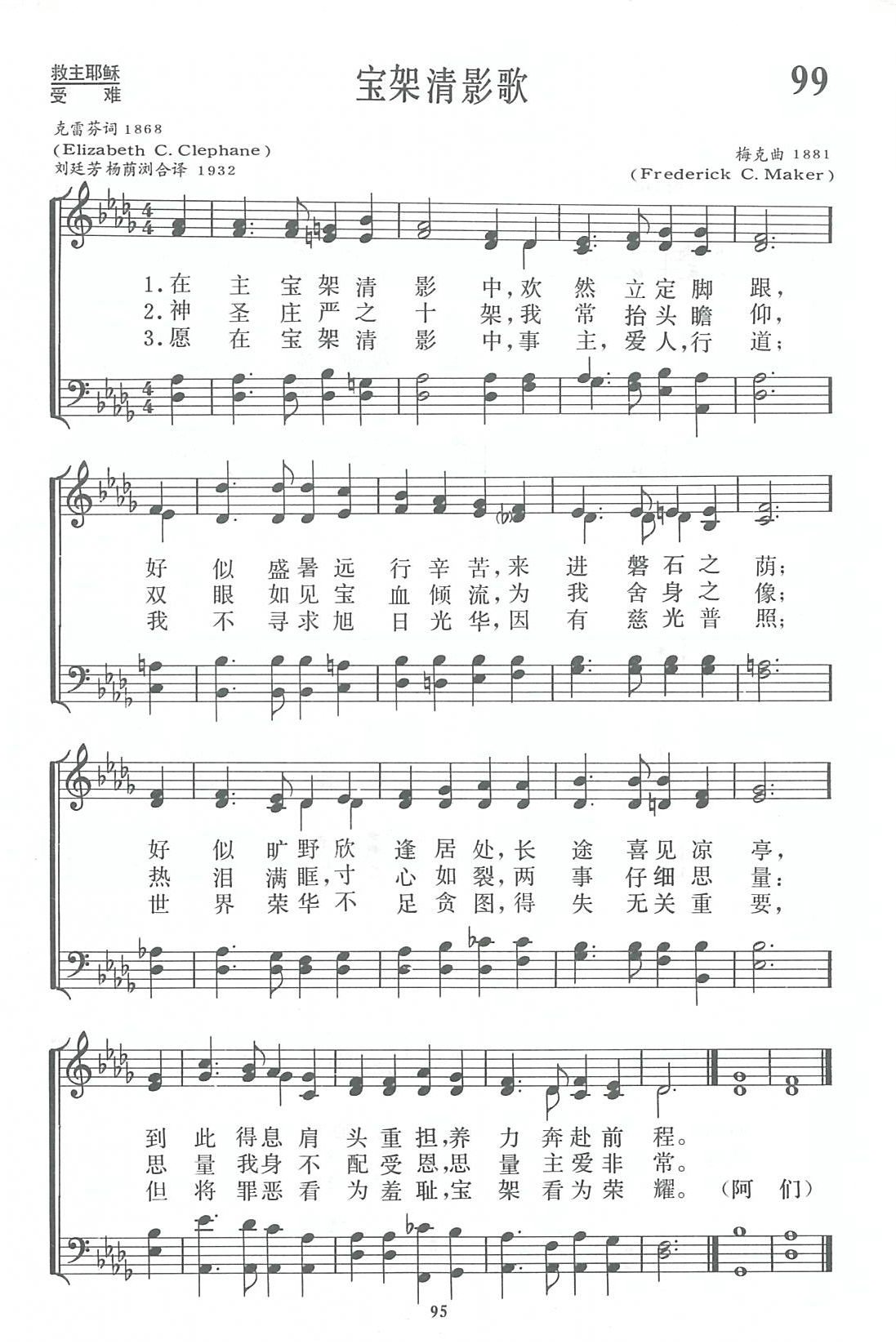 克雷芬不是一位著名的作家,但爱好文艺,时常在儿童杂志和当时最流行的灵修刊物《家庭宝库》上发表诗文。这首《宝架清影歌》便是其中之一,和《主寻亡羊歌》一样经过桑基先生的采用和配曲,并被选入了许多赞美诗集里。原诗共有五节,《新编》选其中三节。第一节述说十字架乃心灵的归宿。其中满了圣经的比喻如“磐石之荫” (见以赛亚书第32章第2节的“避风所,像大磐石的影子”);“旷野欣逢居处”可参阅诗篇第63篇第1节“在干旱疲乏无水之地”,“在旷野有行路人住宿之处” (耶9:2),“使疲乏人得安息”(赛28:12),“白日可以得荫避暑”(赛4:6)。总结于耶稣所说的:“凡劳苦担重担的人,可以到我这里来 ……得享安息” (太 11:28—29)等。