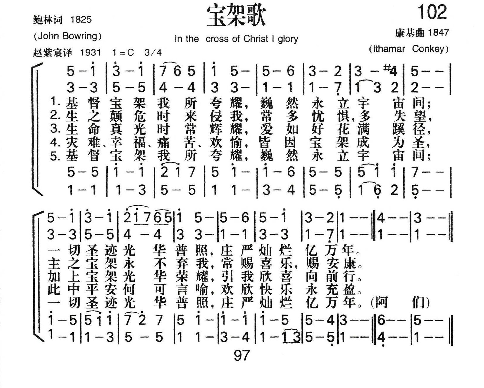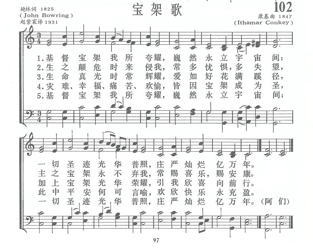 这首圣诗最早的中文译文,出自宣教士伯鲁格牧师(H. Blodgett)的手笔,歌名是「宝架荣尊」,歌词古色古香,令人激赏: