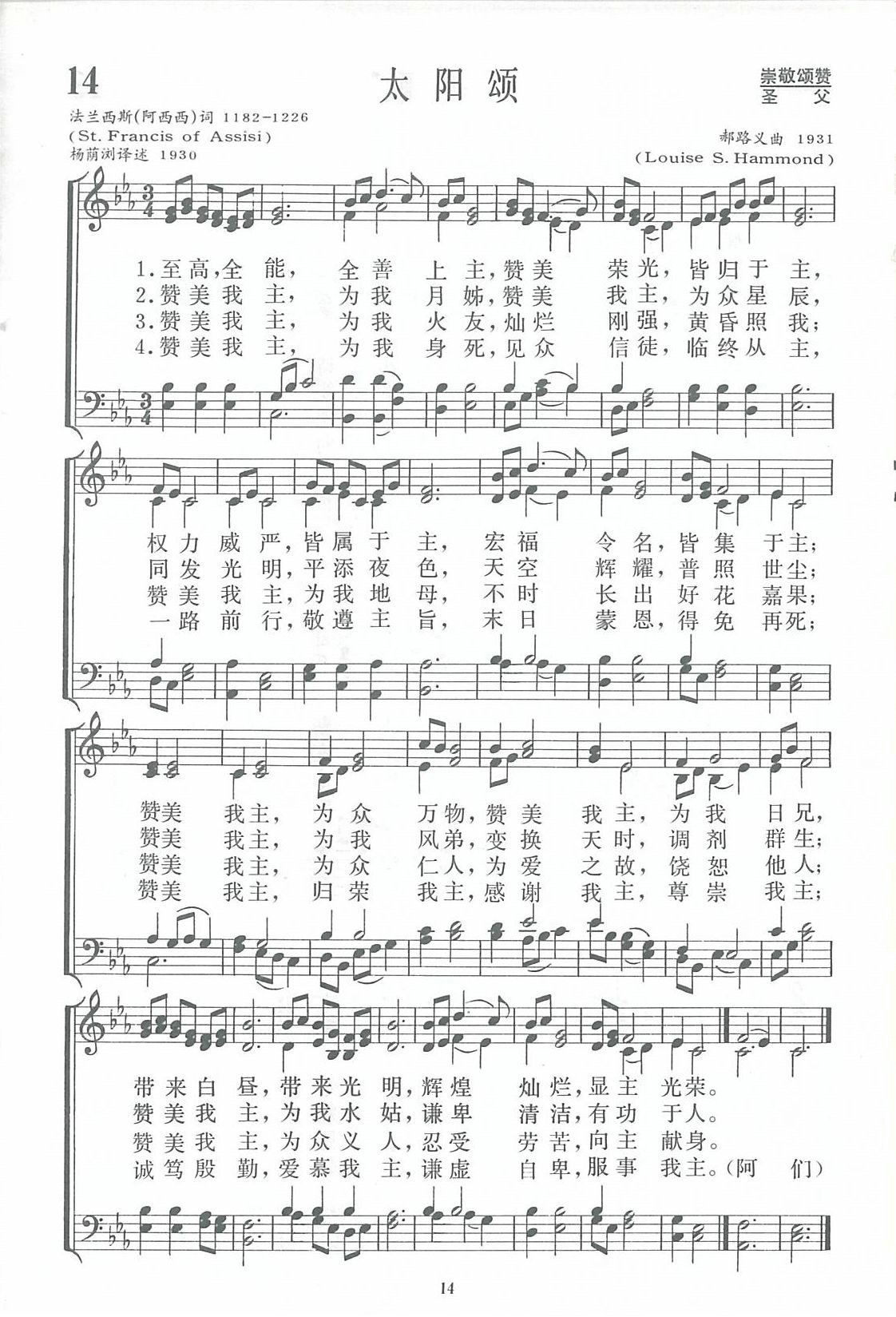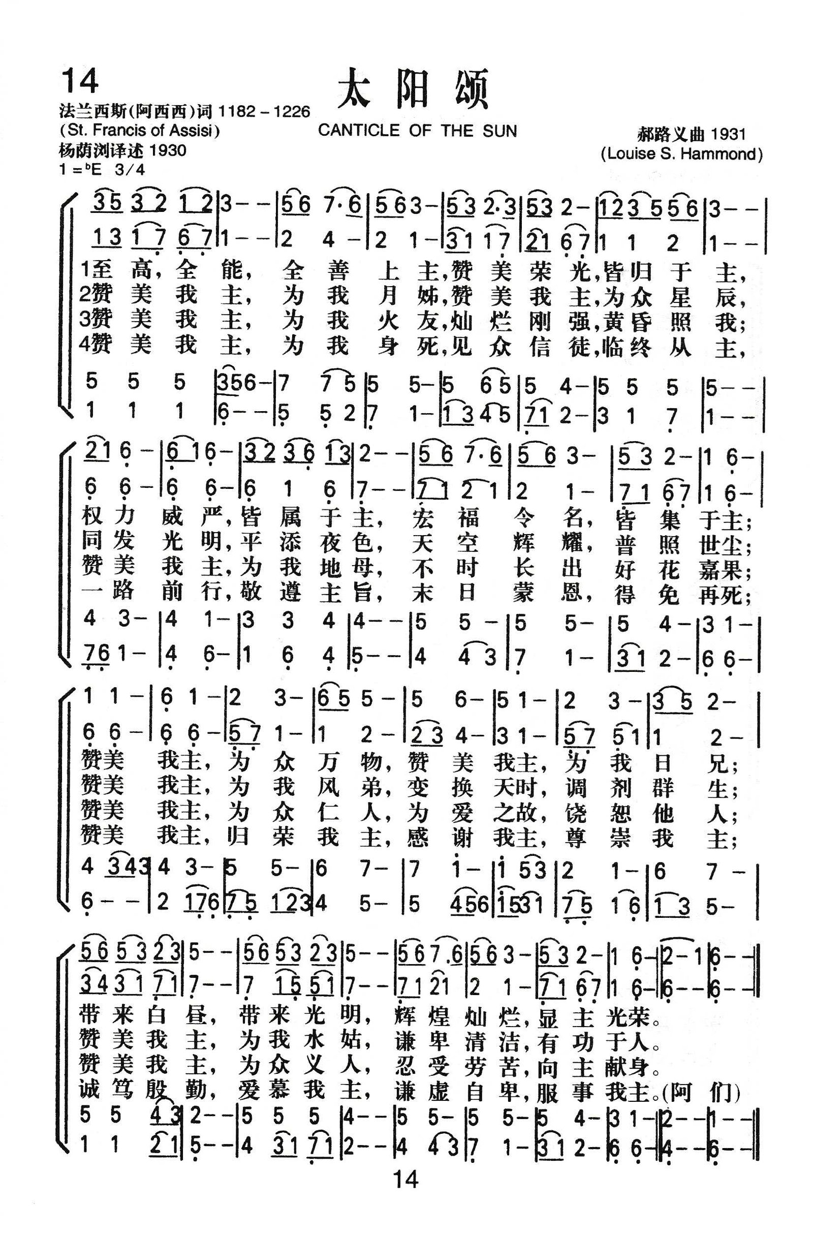 《新编》的《太阳颂》是根据《普天颂赞》第19首杨荫浏于1930年译述的韵诗,由美国圣公会来华传教士郝路义 (L.S.Hammond)于1931年特为《普天颂赞》所谱。这首曲调带有中国风味,优美流畅,曲调名为《鸟语 (SUBASIA)》