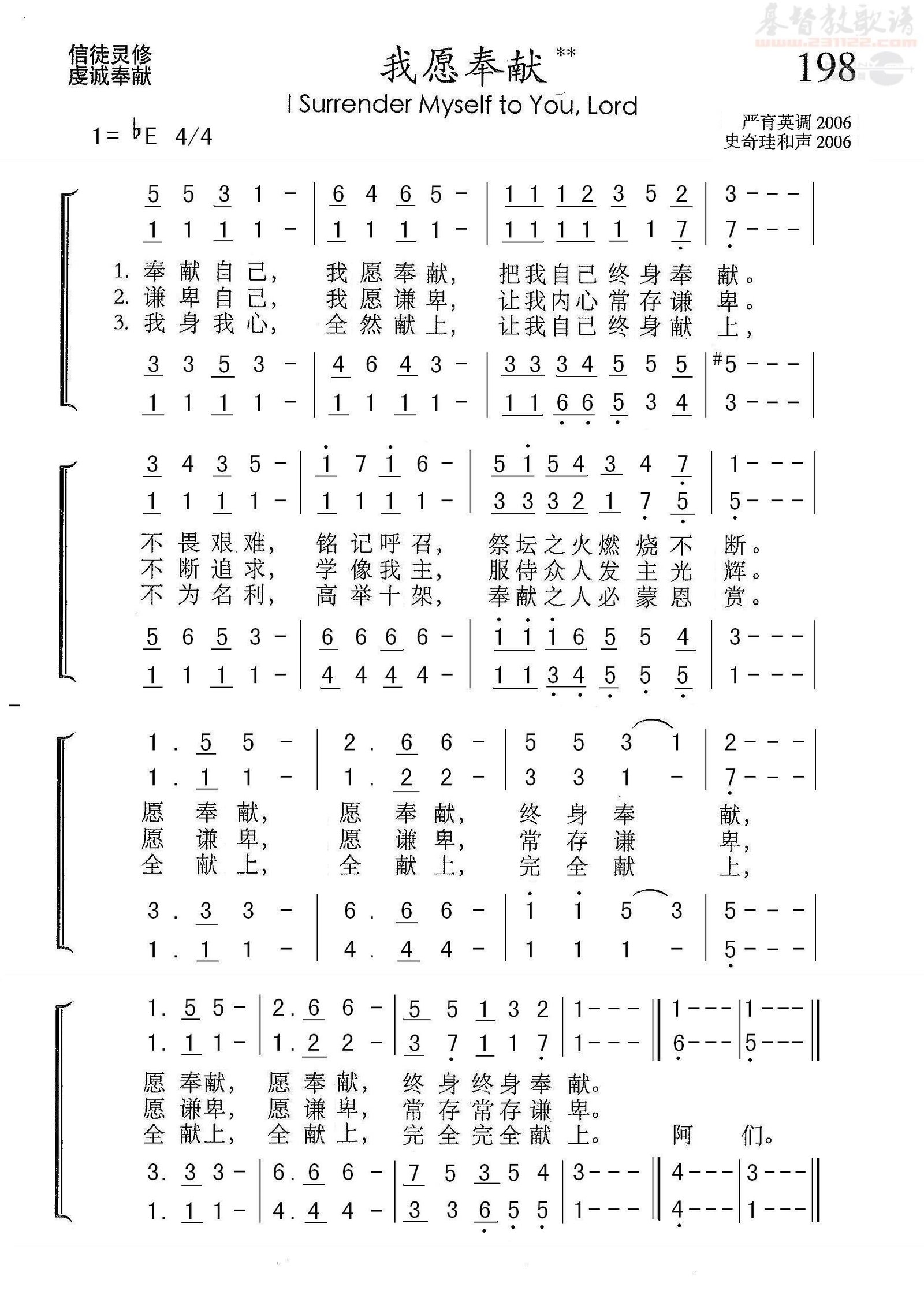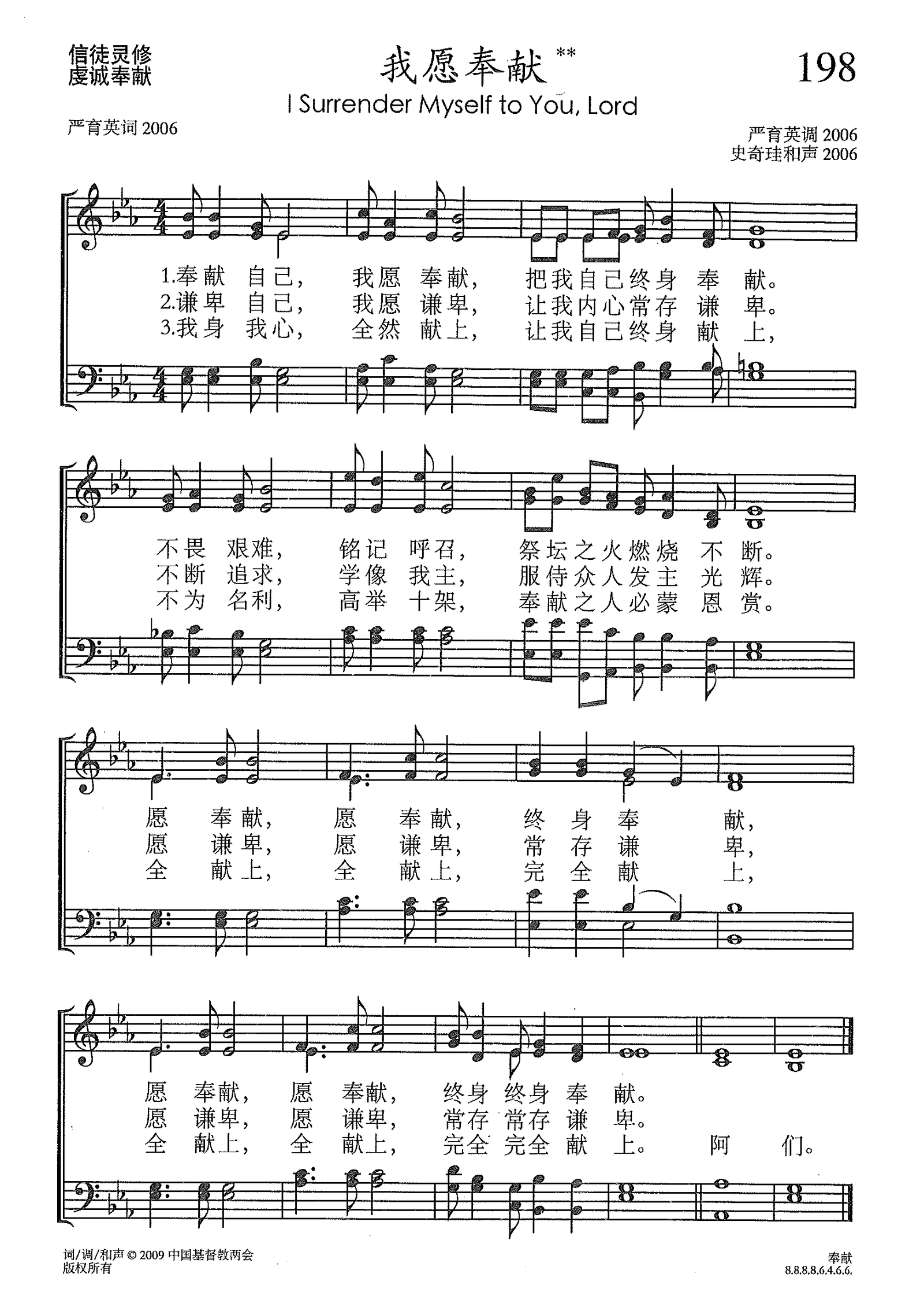 我愿奉献 ( I Surrender Myself to You, Lord ) 2023年9月18日 作者 Liu, Luke 在线播放和下载: 合唱 四声 https://www.chanshige.online/wp-content/uploads/2023/09/20230918_010645.mp3 下载 女高 https://www.chanshige.online/wp-content/uploads/2023/09/20230918_010636.mp3 下载 女低 https://www.chanshige.online/wp-content/uploads/2023/09/20230918_010630.mp3 下载 男高 https://www.chanshige.online/wp-content/uploads/2023/09/20230918_010701.mp3 下载 男低 https://www.chanshige.online/wp-content/uploads/2023/09/20230918_010654.mp3 下载 伴奏 四声 https://www.chanshige.online/wp-content/uploads/2023/09/20230918_010639.mp3 下载 女高 https://www.chanshige.online/wp-content/uploads/2023/09/20230918_010634.mp3 下载 女低 https://www.chanshige.online/wp-content/uploads/2023/09/20230918_010628.mp3 下载 男高 https://www.chanshige.online/wp-content/uploads/2023/09/20230918_010657.mp3 下载 男低 https://www.chanshige.online/wp-content/uploads/2023/09/20230918_010651.mp3 下载 本首圣诗由网上圣诗班 (南京)录制 歌谱:1. 四声五线谱 2. 四声部简谱 简介(一) ( 暂缺 ) 我愿奉献 《赞美诗(新编)补充本》第198首 I Surrender Myself to You, Lord