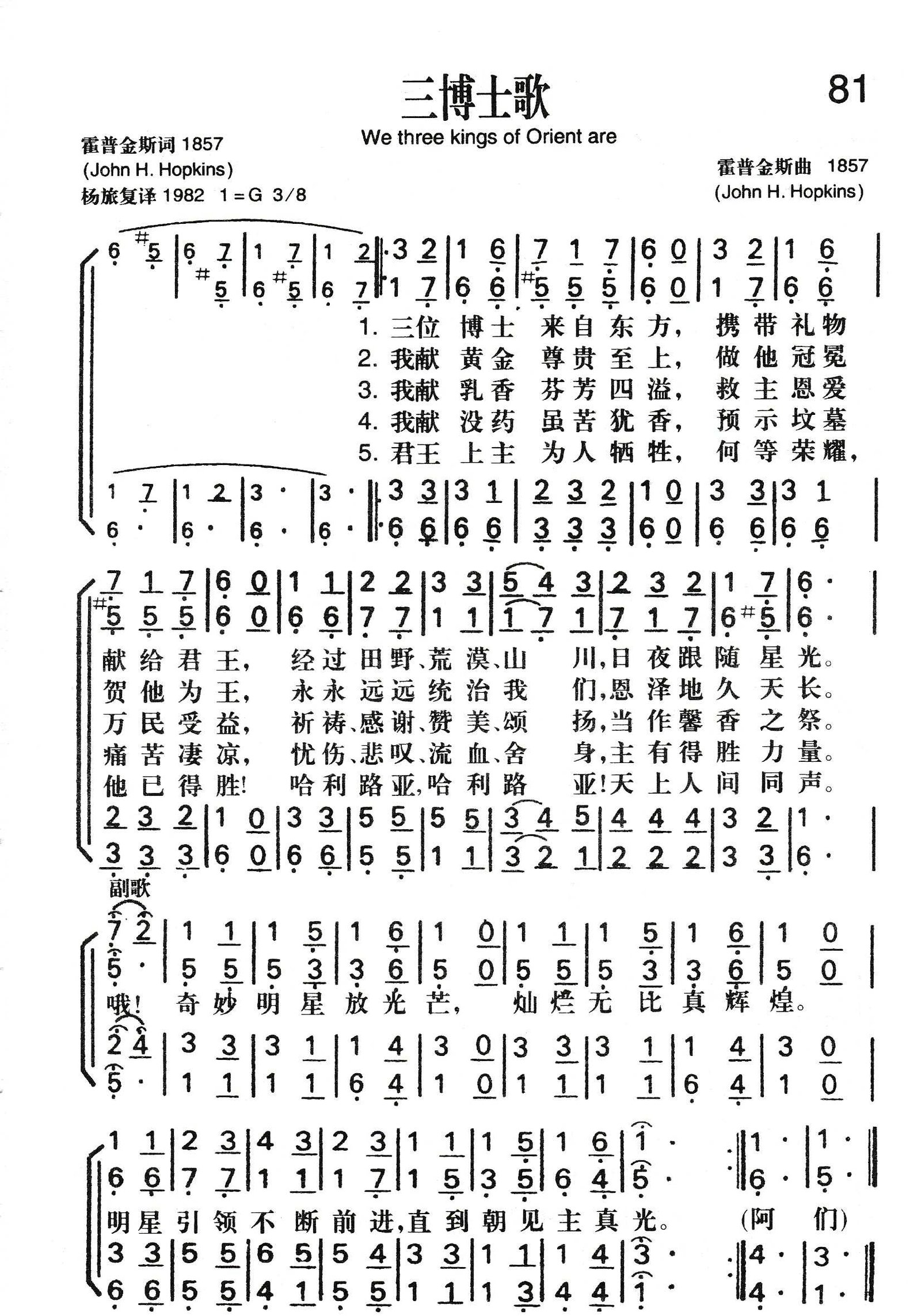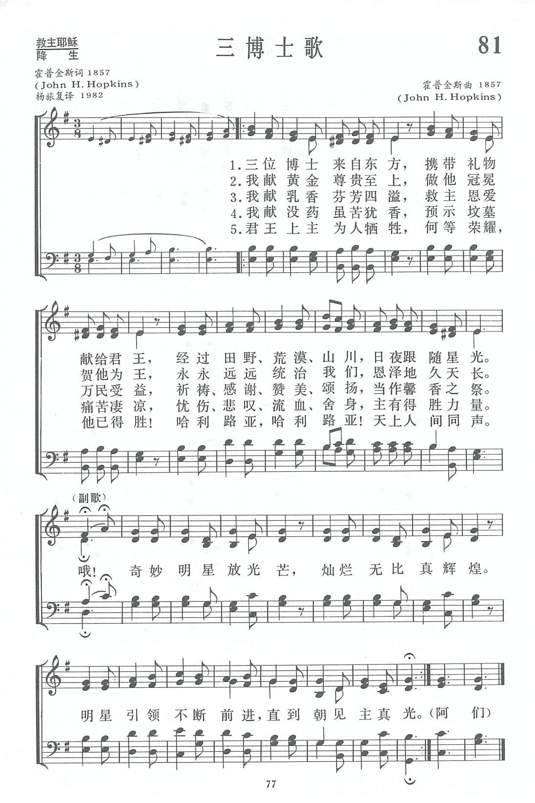 《三博士歌》又称《东方博士歌》。词和曲都是美国圣公会牧师霍普金斯 (J.H.Hopkins,1820一1891)作于 1857年。这首诗在被选入赞美诗之前,已经在教会中相当流行,因为它的词意便于圣诞表演。它的旋律活泼动人,易学易唱,带有浓厚的民间歌曲气息。
