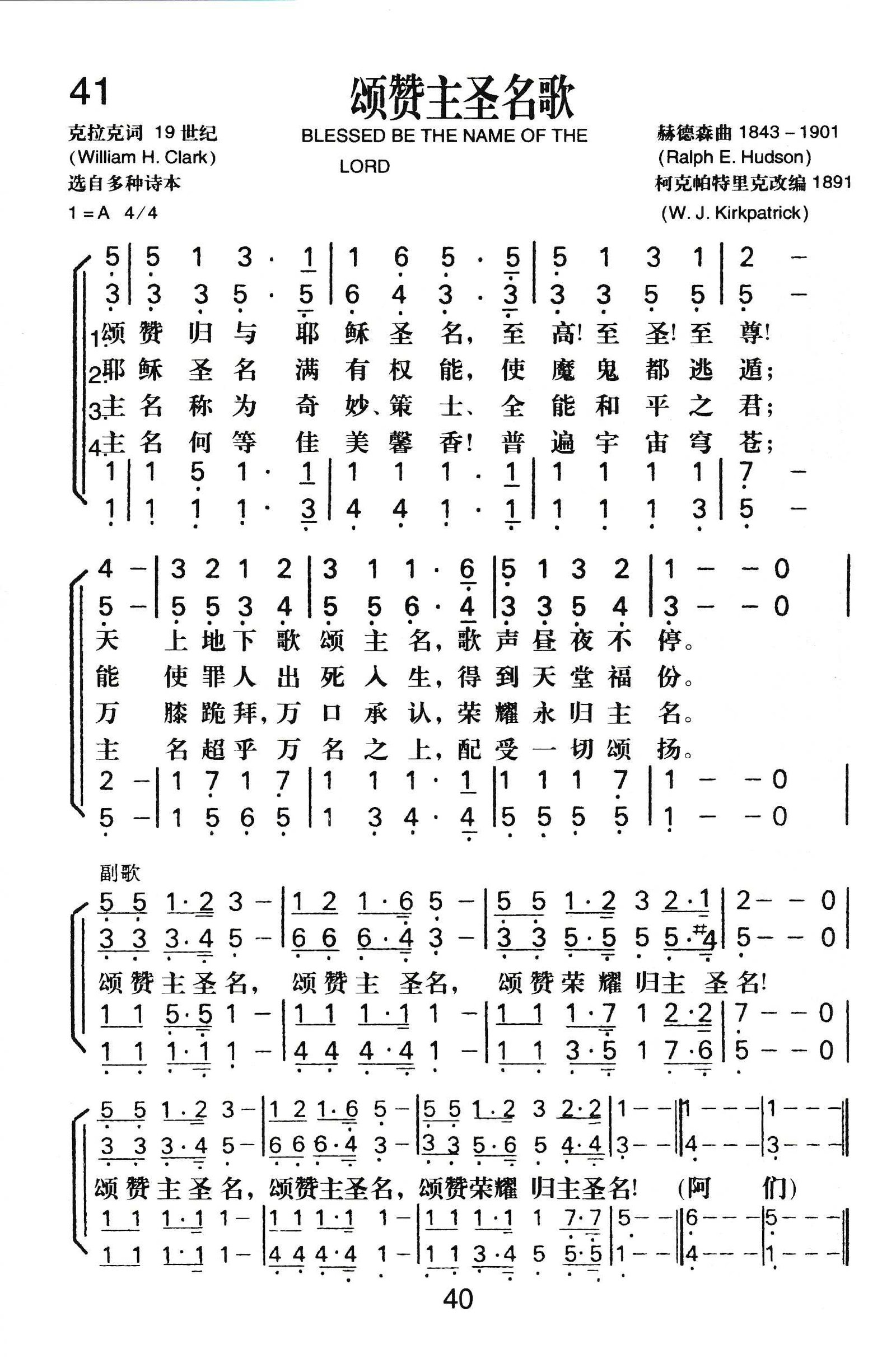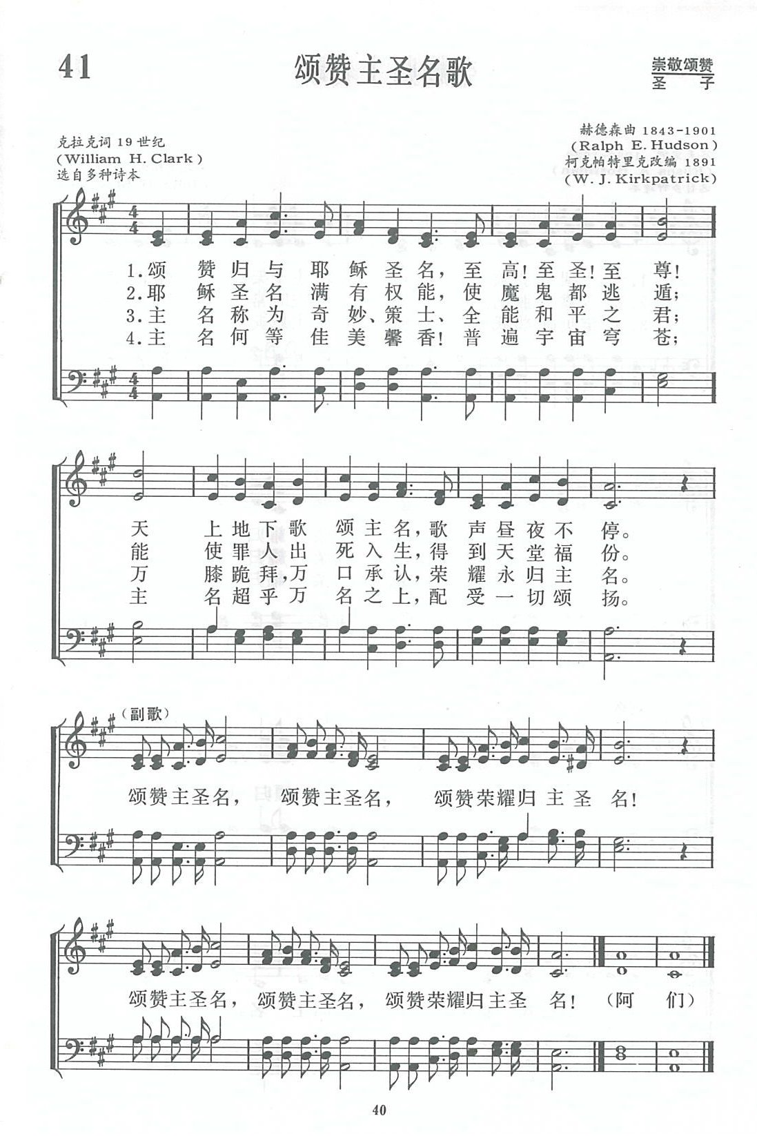 《颂赞主圣名歌》原是在野外帐篷布道会时所唱的一首曲调(是一首民歌)。它是19世纪流行的布道诗歌之一,曾被配用于好几首圣诗,是赫德森 (R.E.Hudson,1843— 1901)所编乐曲之一。赫德森出生于美国俄亥俄州拿破仑市,南北战争时参加联军,在安纳波利斯城总医院任护士。退伍后在音乐学院教音乐,并在美以美会任布道员。他是歌唱家、诗歌作者和编者,曾出版好几本赞美诗集,在福音诗歌中颇负盛名。
