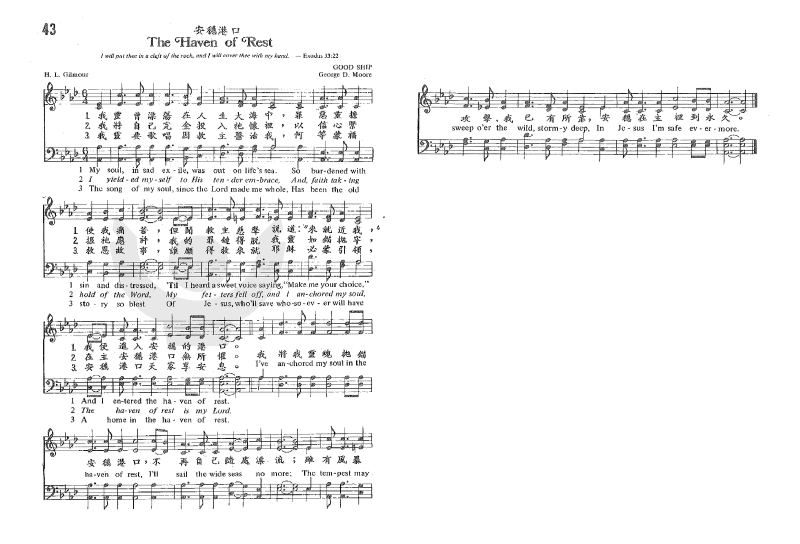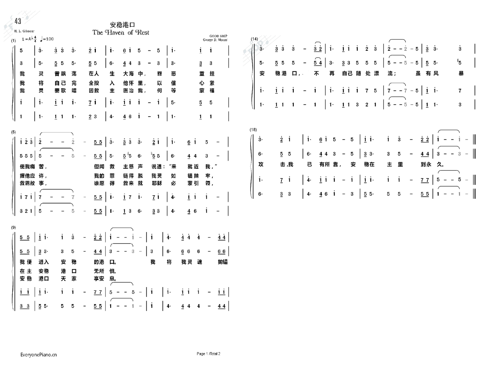 安稳港口 (The Haven of Rest) 2024年8月21日 作者 Liu, Luke 在线播放和下载: 合唱 四声 https://www.chanshige.online/wp-content/uploads/2024/08/20240821_001233.mp3 下载 女高 https://www.chanshige.online/wp-content/uploads/2024/08/20240821_001154.mp3 下载 女低 https://www.chanshige.online/wp-content/uploads/2024/08/20240821_001125.mp3 下载 男高 https://www.chanshige.online/wp-content/uploads/2024/08/20240821_001048.mp3 下载 男低 https://www.chanshige.online/wp-content/uploads/2024/08/20240821_001001.mp3 下载 伴奏 四声 https://www.chanshige.online/wp-content/uploads/2024/08/20240821_001214.mp3 下载 女高 https://www.chanshige.online/wp-content/uploads/2024/08/20240821_001140.mp3 下载 女低 https://www.chanshige.online/wp-content/uploads/2024/08/20240821_001114.mp3 下载 男高 https://www.chanshige.online/wp-content/uploads/2024/08/20240821_001022.mp3 下载 男低 https://www.chanshige.online/wp-content/uploads/2024/08/20240821_000945.mp3 下载 本首圣诗由网上圣诗班 (青草地)录制 歌谱:1. 四声五线谱 2. 四声部简谱 简介(一) ( 来源:网页 ) 安稳港口 (选自《教会圣诗》第43首) The Haven of Rest 作词:亨利·莱克·吉尔摩(Gilmour, H. L. (Henry Lake), 1836-1920) 英国。他出生于爱尔兰伦敦德里,十几岁时移民美国,想学习航海。到达美国后,他来到费城,决定在美国闯荡。他开始当画家,然后参加了美国内战,在战争中被捕并在弗吉尼亚州里士满的利比监狱服刑数月。他于 1858 年与莱蒂西亚·波琳·霍华德结婚。战后,他接受了牙医培训,并干了很多年。1869 年,他搬到新泽西州韦诺纳,并于 1885 年帮助在那里建立了卫理公会教堂。他担任主日学校长,并在皮特曼格罗夫营地大会上指挥唱诗班长达四十年,还在马里兰州山湖公园和宾夕法尼亚州里奇维尤公园的营地大会上担任歌唱领队。他是一名编辑、作家和作曲家。他与约翰·斯威尼、J·林肯·霍尔、约翰·J·胡德、霍华德·恩特维斯尔、乔舒亚·吉尔、EL·海德、米尔顿·S·里斯和威廉·J·柯克帕特里克一起编辑和/或出版了 25 本福音歌曲集。他在新泽西州德莱尔因马车事故去世。 作曲:乔治·D·摩尔( George D. Moore) 19 世纪后期,他曾是新泽西州和宾夕法尼亚州的巡回传教士。他为亨利·莱克·吉尔摩 1885 年的赞美诗歌词谱曲。