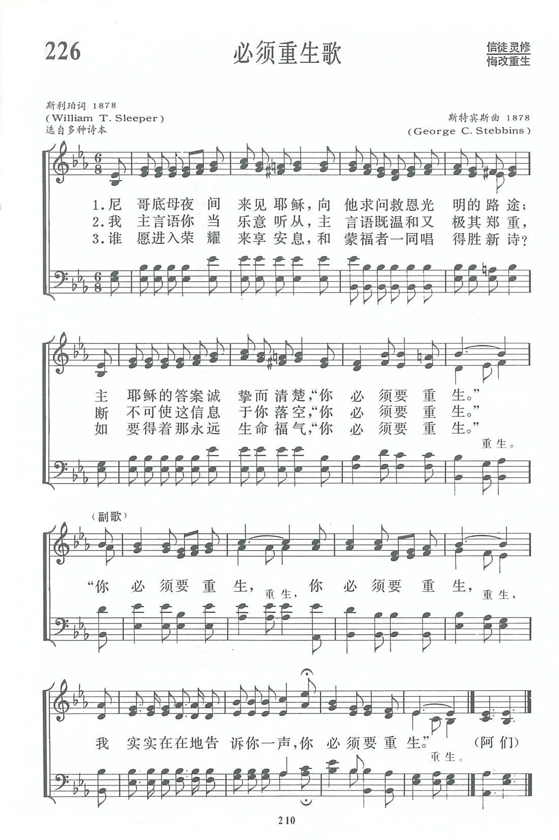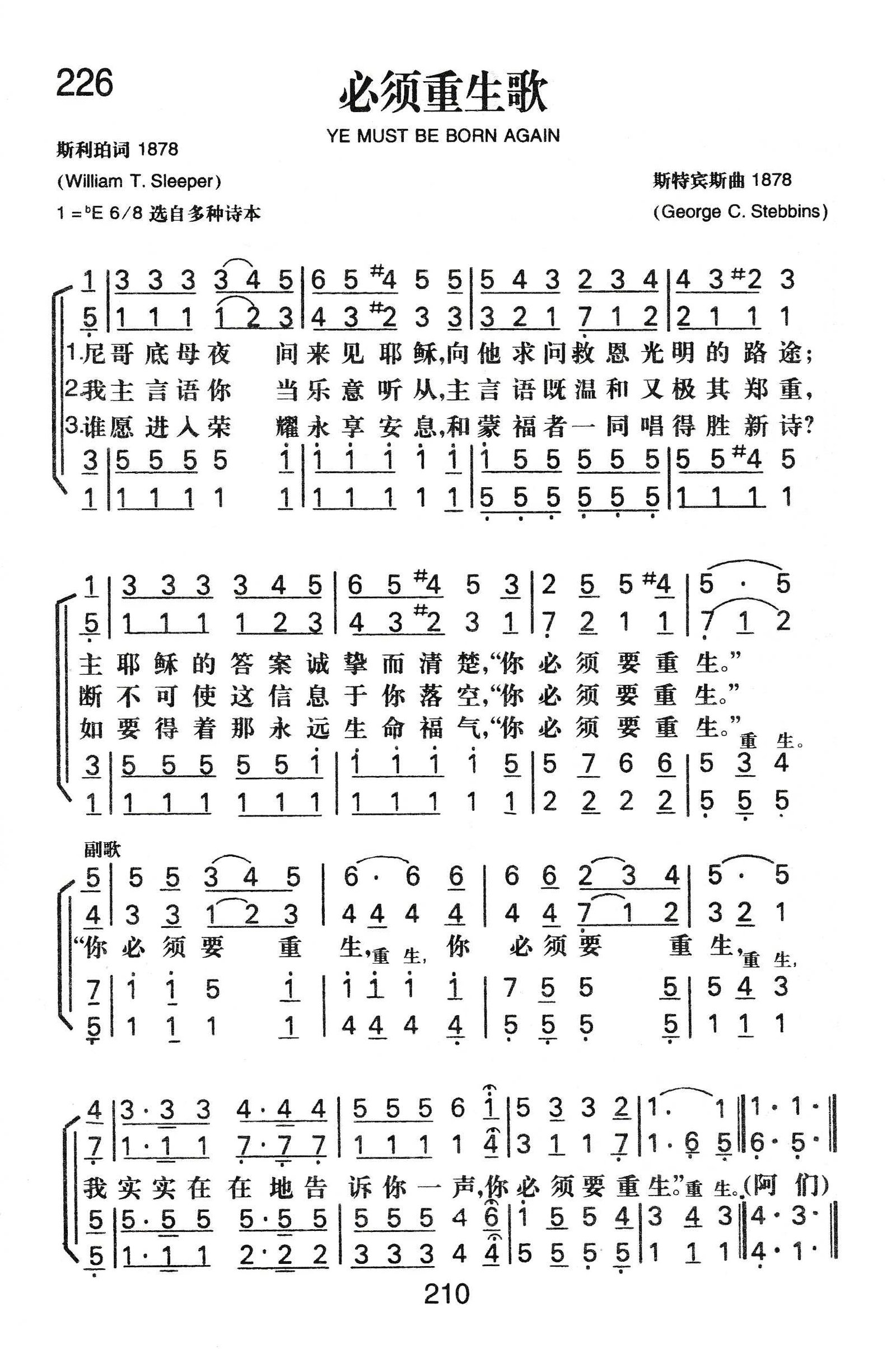 这首诗是斯利珀 (W.T.Sleeper,18l9一l904)作词。原诗第一句为“有一个官晚上来见耶稣”,汉译直接点出这个官的名字:“尼哥底母夜间来见耶稣”。