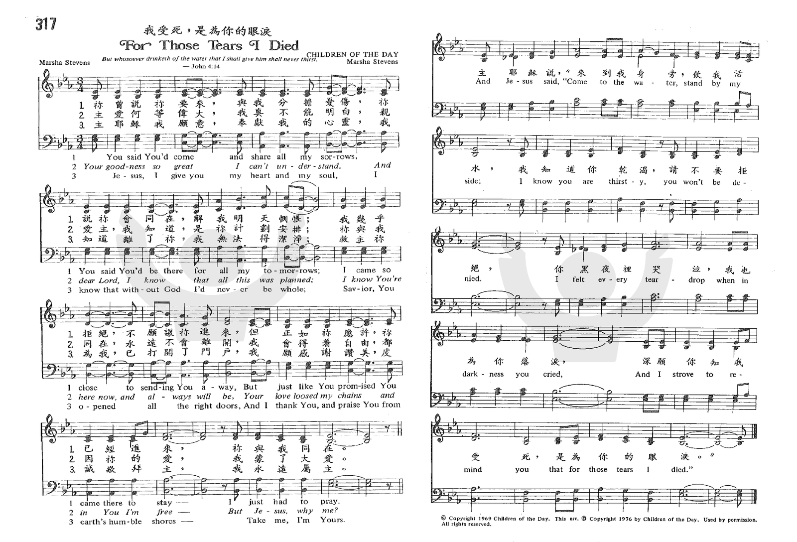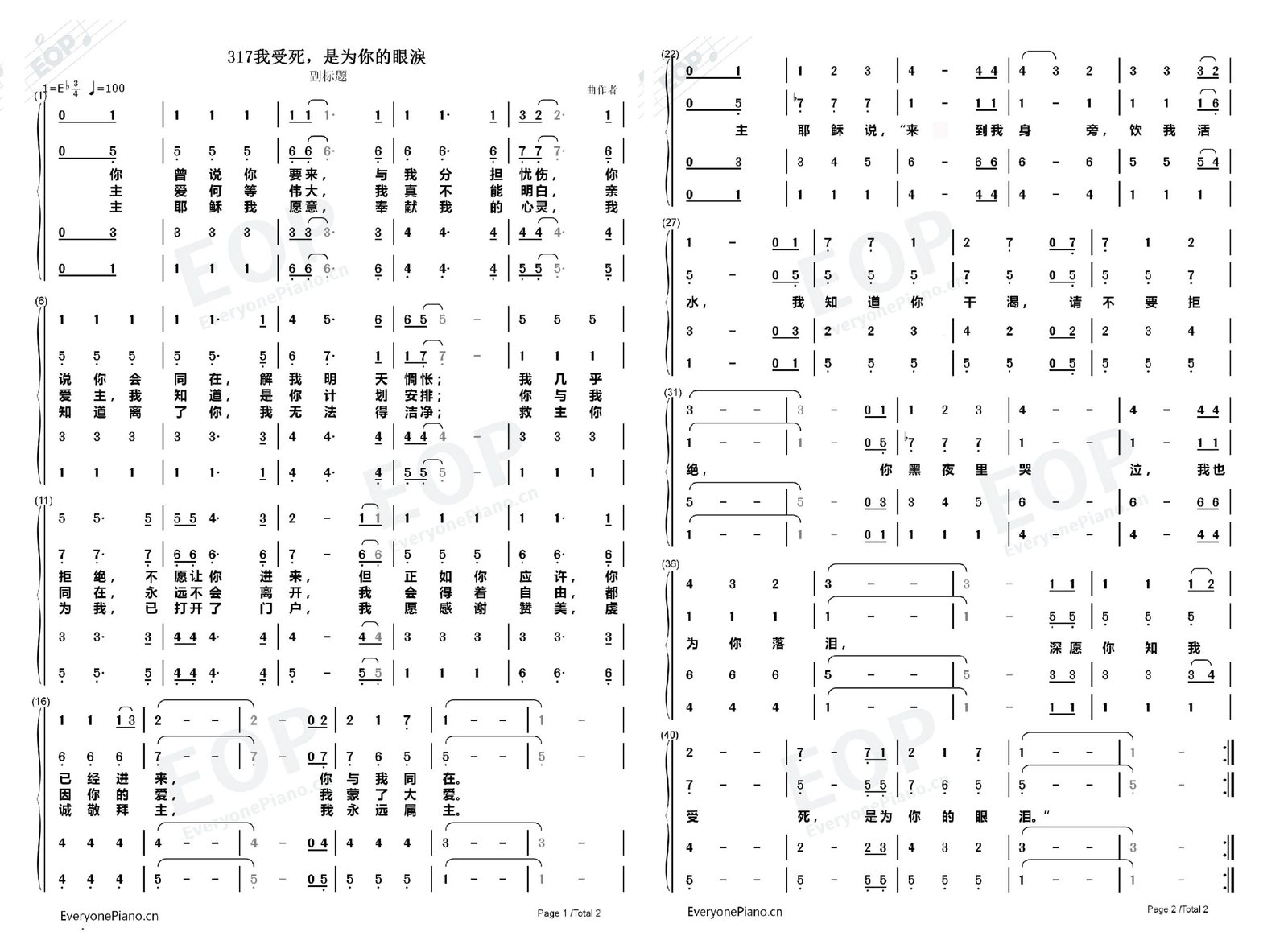 我受死,是为你的眼淚 (For Those Tears I Died) 2026年2月2日 作者 Liu, Luke 在线播放和下载: 合唱 四声 https://www.chanshige.online/wp-content/uploads/2026/02/20260202_011620.mp3 下载 女高 https://www.chanshige.online/wp-content/uploads/2026/02/20260202_011351.mp3 下载 女低 https://www.chanshige.online/wp-content/uploads/2026/02/20260202_011216.mp3 下载 男高 https://www.chanshige.online/wp-content/uploads/2026/02/20260202_011116.mp3 下载 男低 https://www.chanshige.online/wp-content/uploads/2026/02/20260202_011004.mp3 下载 伴奏 四声 https://www.chanshige.online/wp-content/uploads/2026/02/20260202_011449.mp3 下载 女高 https://www.chanshige.online/wp-content/uploads/2026/02/20260202_011312.mp3 下载 女低 https://www.chanshige.online/wp-content/uploads/2026/02/20260202_011132.mp3 下载 男高 https://www.chanshige.online/wp-content/uploads/2026/02/20260202_011050.mp3 下载 男低 https://www.chanshige.online/wp-content/uploads/2026/02/20260202_010906.mp3 下载 本首圣诗由网上圣诗班 (南京)录制 歌谱:1. 四声五线谱 2. 四声部简谱 简介(一) 《暂缺》 我受死,是为你的眼淚 选自《教会圣诗》第317首 For Those Tears I Did 作者: