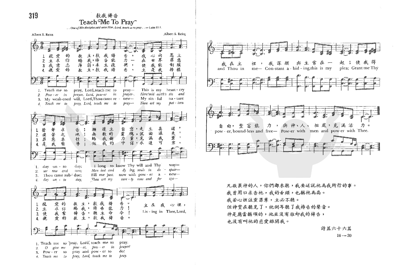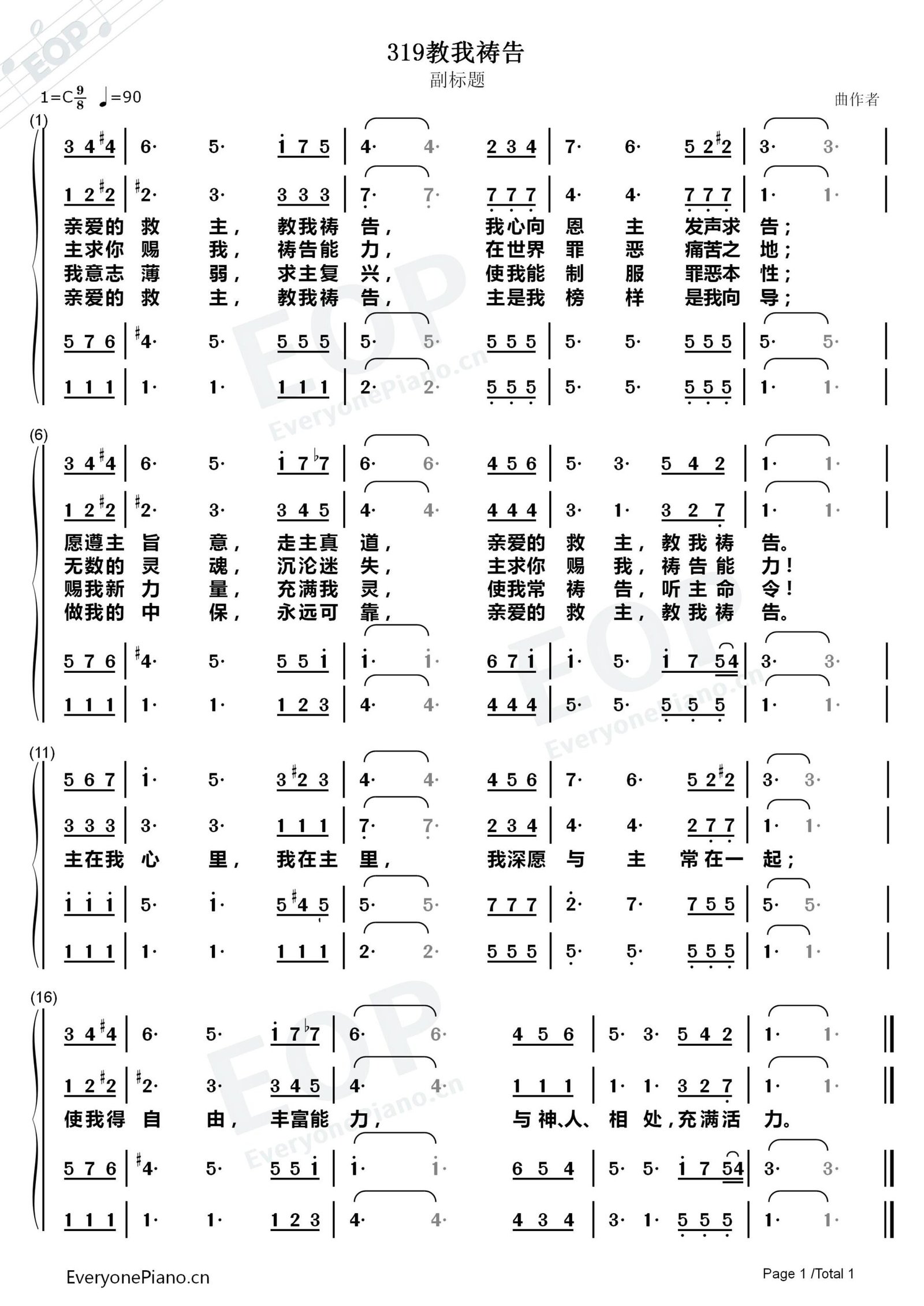 教我祷告 (Teach Me To Pray) 2026年2月18日 作者 Liu, Luke 在线播放和下载: 合唱 四声 https://www.chanshige.online/wp-content/uploads/2026/02/20260217_183912.mp3 下载 女高 https://www.chanshige.online/wp-content/uploads/2026/02/20260217_183901.mp3 下载 女低 https://www.chanshige.online/wp-content/uploads/2026/02/20260217_183859.mp3 下载 男高 https://www.chanshige.online/wp-content/uploads/2026/02/20260217_183856.mp3 下载 男低 https://www.chanshige.online/wp-content/uploads/2026/02/20260217_183853.mp3 下载 伴奏 四声 https://www.chanshige.online/wp-content/uploads/2026/02/20260217_183903.mp3 下载 女高 https://www.chanshige.online/wp-content/uploads/2026/02/20260217_183900.mp3 下载 女低 https://www.chanshige.online/wp-content/uploads/2026/02/20260217_183857.mp3 下载 男高 https://www.chanshige.online/wp-content/uploads/2026/02/20260217_183855.mp3 下载 男低 https://www.chanshige.online/wp-content/uploads/2026/02/20260217_183852.mp3 下载 本首圣诗由网上圣诗班 (南京)录制 歌谱:1. 四声五线谱 2. 四声部简谱 简介(一) 《暂缺》 教我祷告 选自《教会圣诗》第319首 Teach Me To Pray 作者: